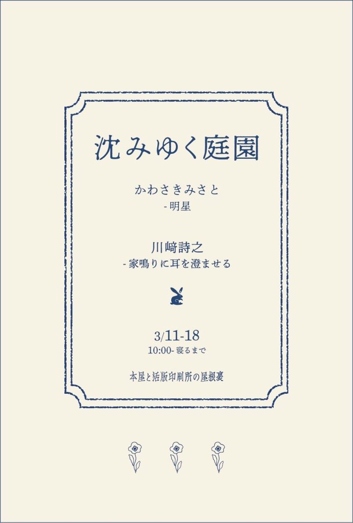 『沈みゆく庭園』かわさきみさと 川﨑詩之 展 2023 8/04 屋根裏 屋根裏イベント 屋根裏展示 『沈みゆく庭園』かわさきみさと 川﨑詩之 展2023年3月11日(土)~3月18日(土) 屋根裏 屋根裏イベント 屋根裏展示 よかったらシェアしてね! URLをコピーしました! 錦戸俊康 写真展 第23弾「事実の面影」 【卯喜兎嬉茶会】 関連記事 『よるにおばけと』作・文 みなはむ (ミシマ社) 絵本の原画展と読書会 2023年7月10日 齋藤将史作品展〜まほうのホウキ〜 2023年4月18日 【卯喜兎嬉茶会】 2023年4月5日 錦戸俊康 写真展 第23弾「事実の面影」 2022年10月27日 上中万五郎『ちょろっと見て行たっくっどなんマンゴロどんのひっとご絵展』 2022年10月16日 錦戸俊康 写真展 第21弾「光の報酬」 2022年8月31日 『明星』かわさきみさと作品展 2022年8月15日 Step Lightly maya tomiyama 絵画展 2022年8月11日