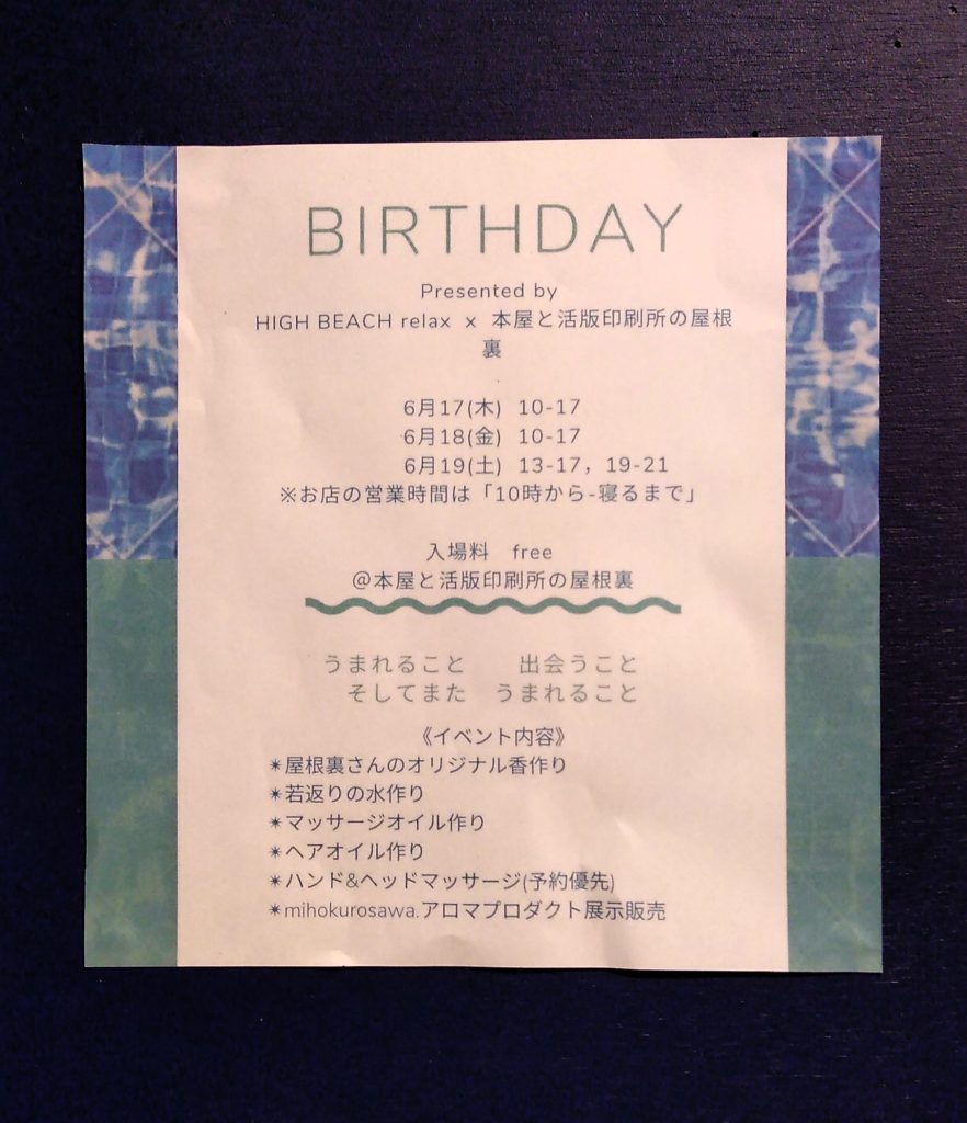 【Birthday】HIGH BEACH Relax 2023 8/04 屋根裏 屋根裏イベント 【Birthday】HIGH BEACH Relax2022年6月17・18・19日 屋根裏 屋根裏イベント よかったらシェアしてね! URLをコピーしました! 【おうちで気軽にお抹茶点ててみましょうの会 天草‘屋根裏’編】 Maya Tomiyama 絵画展.where the lights pours in ひかりが流れこむところ 関連記事 『よるにおばけと』作・文 みなはむ (ミシマ社) 絵本の原画展と読書会 2023年7月10日 齋藤将史作品展〜まほうのホウキ〜 2023年4月18日 【卯喜兎嬉茶会】 2023年4月5日 『沈みゆく庭園』かわさきみさと 川﨑詩之 展 2023年3月13日 錦戸俊康 写真展 第23弾「事実の面影」 2022年10月27日 上中万五郎『ちょろっと見て行たっくっどなんマンゴロどんのひっとご絵展』 2022年10月16日 錦戸俊康 写真展 第21弾「光の報酬」 2022年8月31日 『明星』かわさきみさと作品展 2022年8月15日
